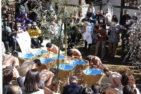 今年は寒暖差が激しい冬ですが、2024年2月18日はよく晴れ、日差しの暖かさを感じられる日となりました。週末の日曜日ということもあり、満開の梅が咲き誇り、多くの参詣者が見守る中、正午より水行が行われ、その後、法楽加持を厳修致しました。